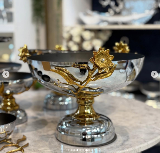 Gold Silver Metal Serving Trays And Tier Stands And Bowls Dishes With Floral Pattern Made of Stainless Steel And Brass India