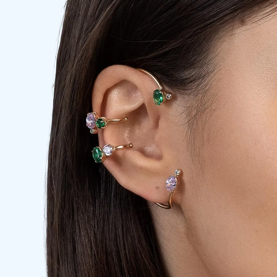 Gold Spring Day Ear Wrap Composed Three Green Diamond and Five White Diamond Ear Cuff 18k Gold Plated Jewelry