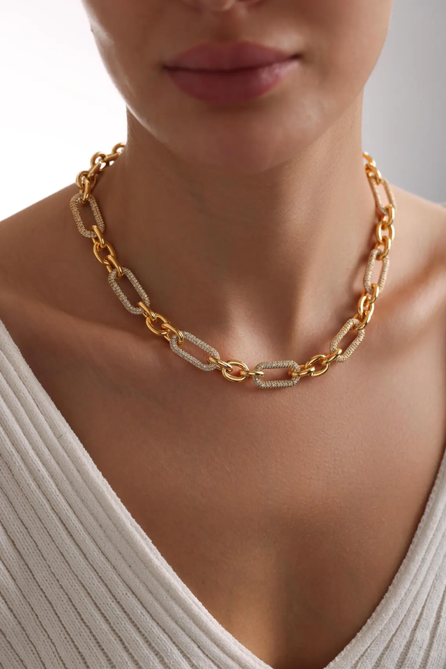 Gold Tone Link Diamond Necklace With Pave Setting Round Cut Diamond Necklace Stylish Chunky Link Chain Diamond Necklace