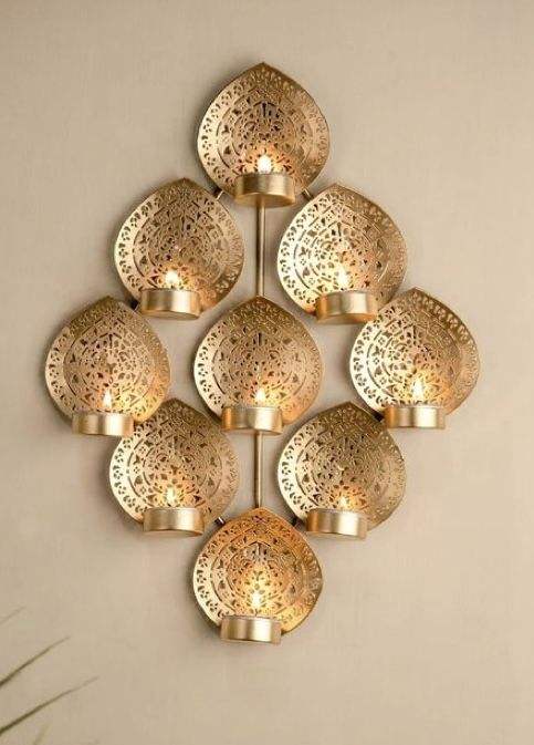 Gold Wall Mounted Metal Candle Holder with Tea Light Multi-Light Decorative Lantern Gold Wall Mounted Tea Light Holder