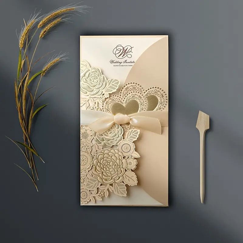 Gold White Laser Cut Wedding Invitation Card Rose Love Heart Greeting Cards Decoration Paper Print with Ribbon Wedding Party