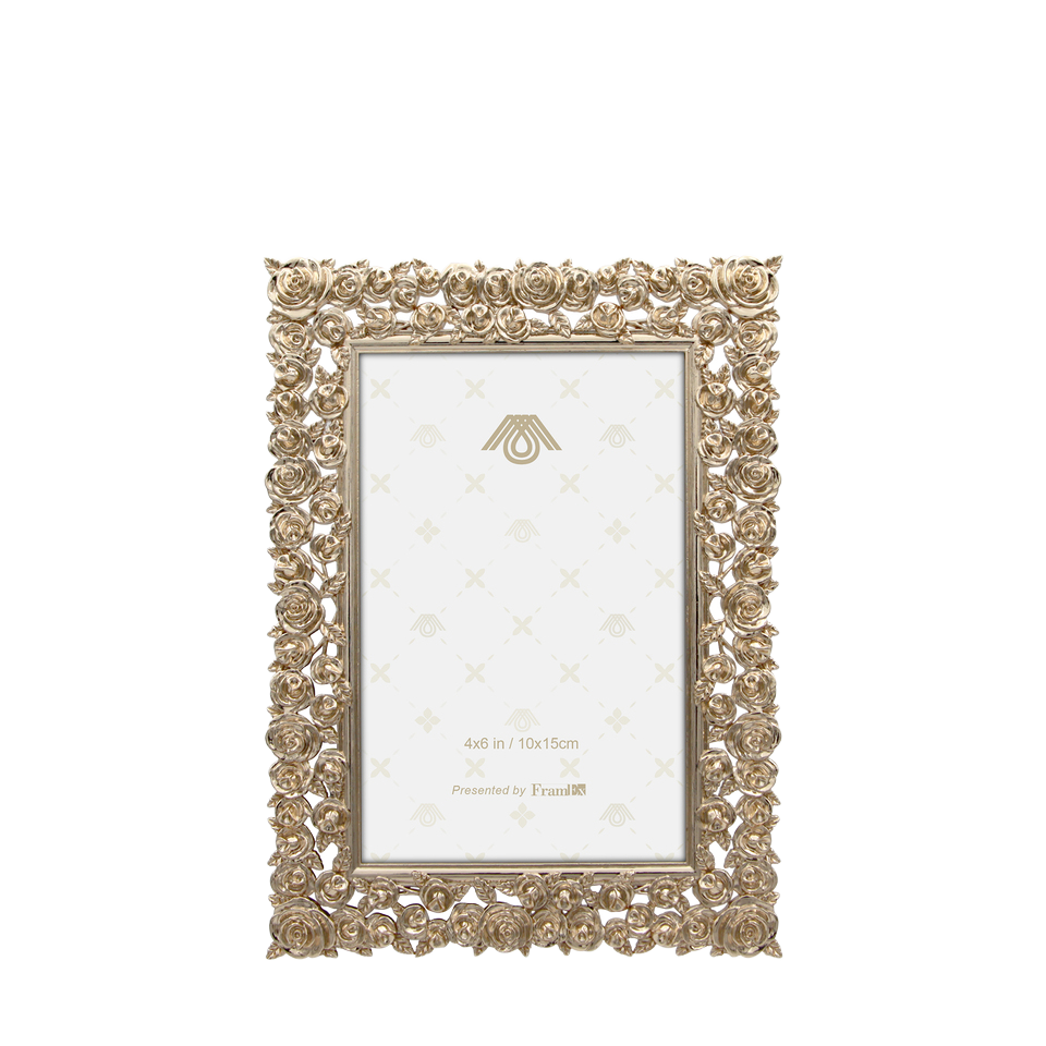 Gold Zinc Alloy Plated Die Cast Rectangular Photo Frame Rose Pattern Hollow Floral Design 4" X 6" Holiday Gift Anniversary
