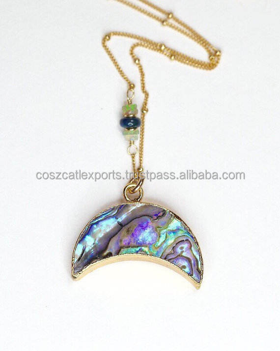 Gold and Rhodium Plated Half Moon Nature Abalone Peacock Sea Shell Gemstone Connector Handmade Stone Bezel Setting Pendants