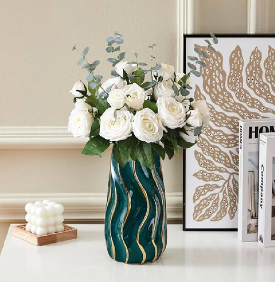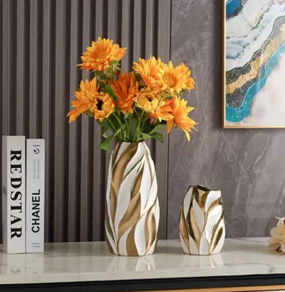 Gold and white vase set, modern textured vases, decorative home accents, abstract floral holders. Available at wholesale prices.