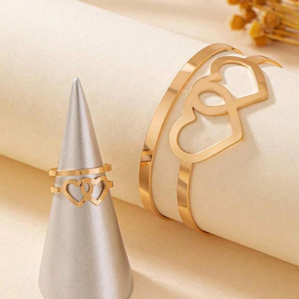Gold double heart hollow fashion bracelet ring set simple geometric fashion hand jewelry