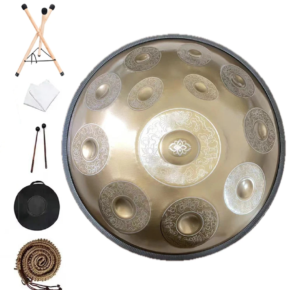 Gold handpan drum, 22-inch 9-note, engraved design, professional quality, resonant and melodic, complete set with stand and bag