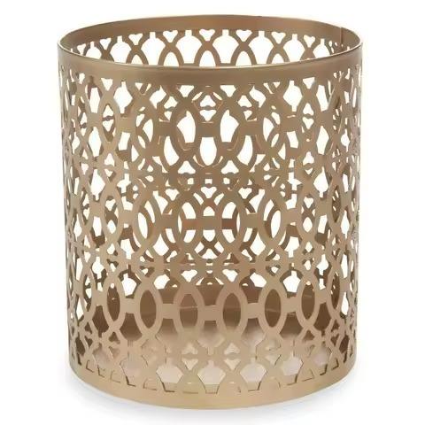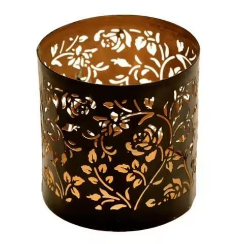 Gold iron votive holder with layered floral detailing laser cut to enhance glow during spiritual practices