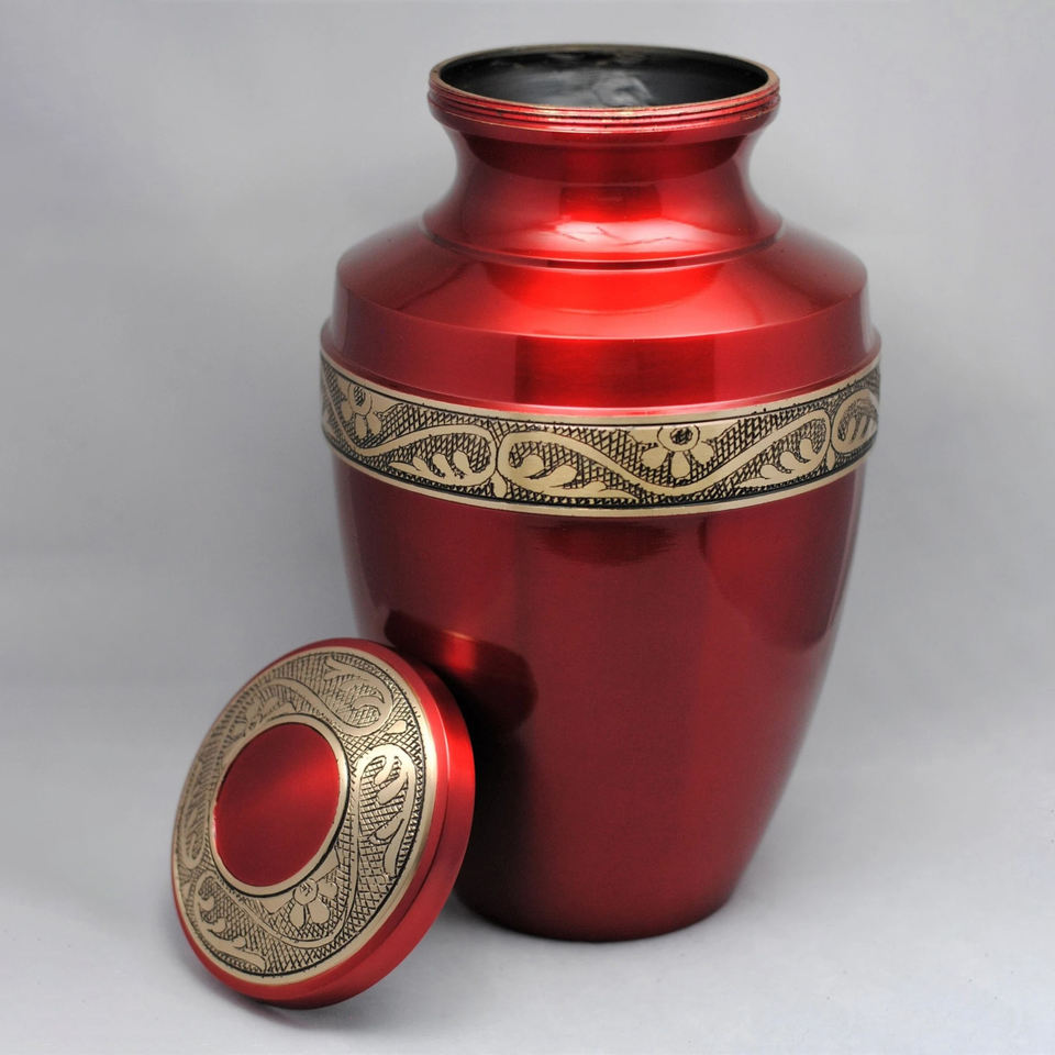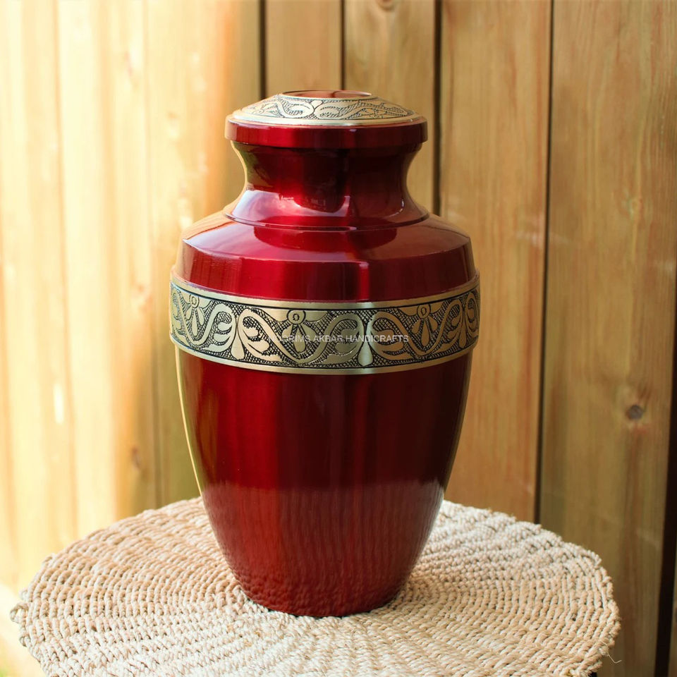 Gold on Crimson Cremation Urn Human Ashes Golden Engraved Brass Urn Handcrafted Adult Memorial Urn Wholesale Exporter Supplier