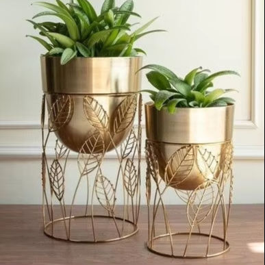 Gold planter with matching metal stand designed for high end home interiors and upscale decorating themes