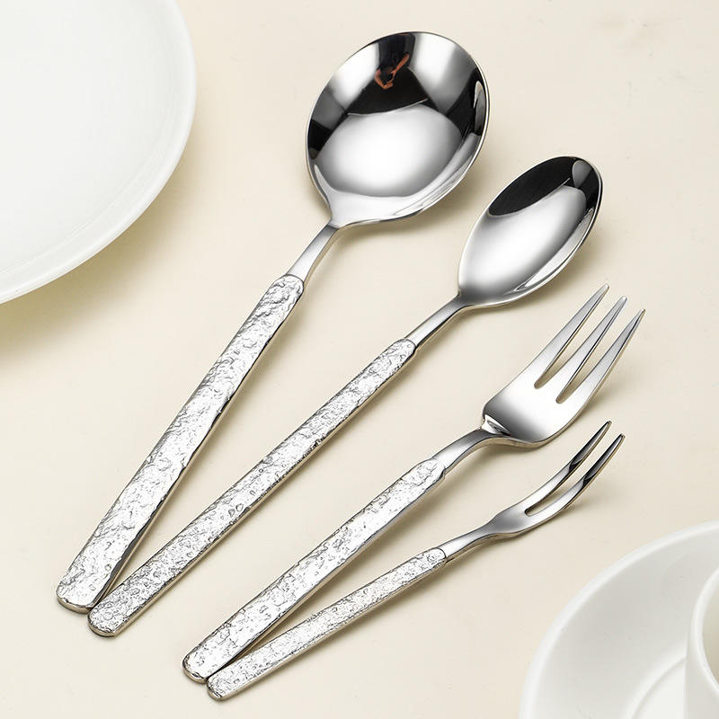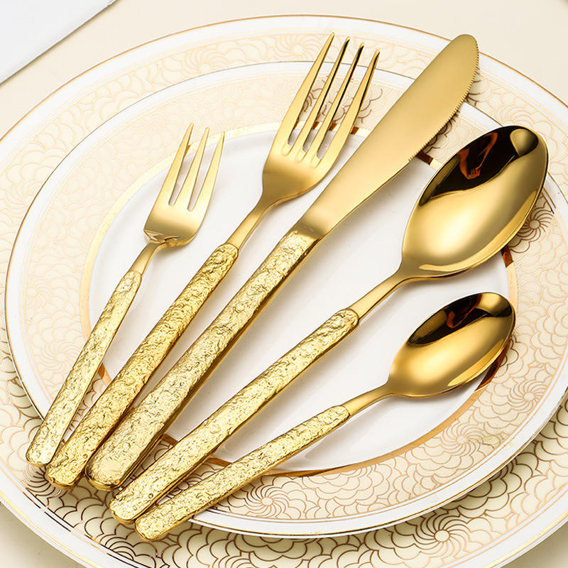 Golden 304 Stainless Steel Steak Knife Fork Spoon Set With Rock Pattern Handle Dishwasher Safe Flatware For Catering