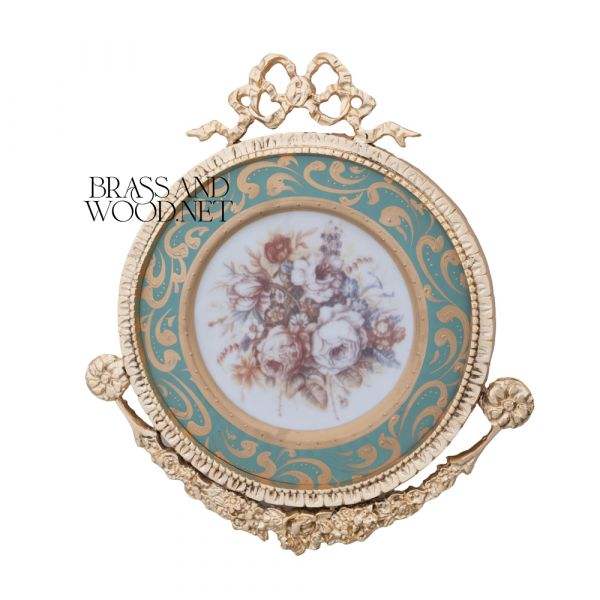 Golden Brass Wall Art Floral Porcelain Plate with Ornate Frame