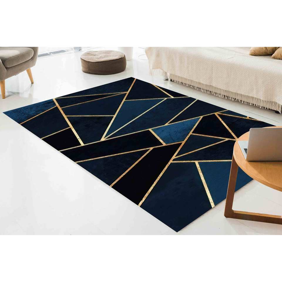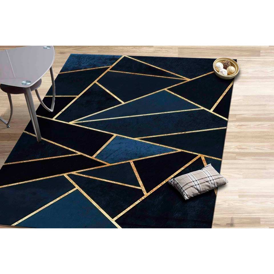 Golden Geometric Navy Blue Chenille Rug: Modern Accent Rug,Nonwoven Soft Rug