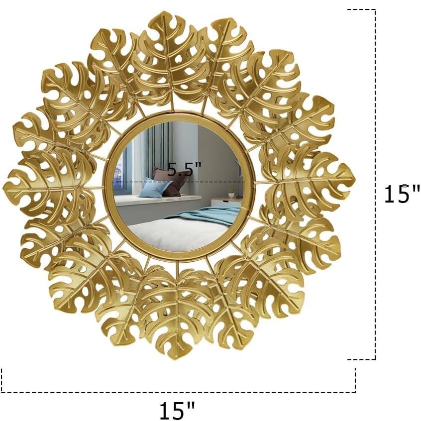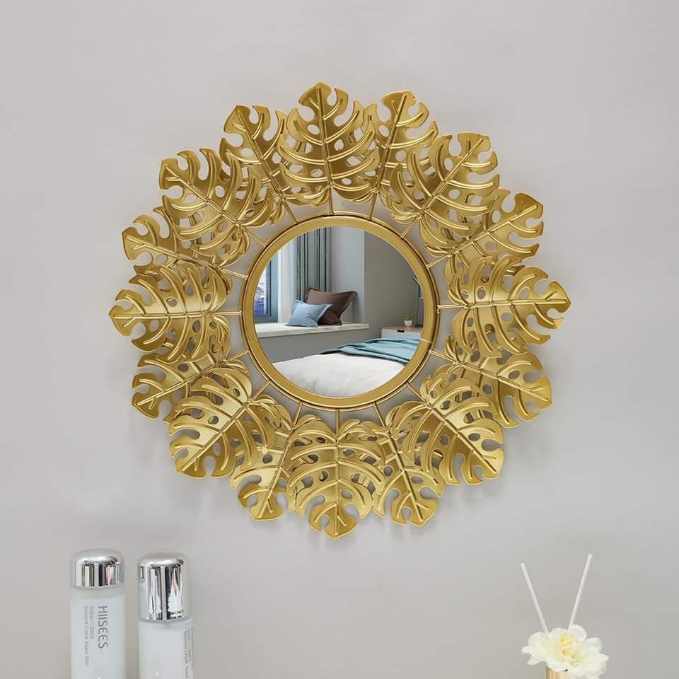 Golden Leaves Designer Metal Wall Mirror for Wedding and Bedroom, Luxury Round Wall Hanging Mirror for Living Room and Hall