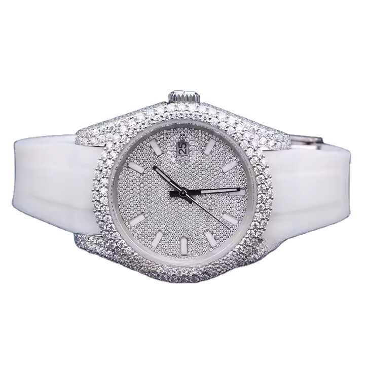 Golden Luxury Classic Fashion Half Iced Moissanite Diamond Red Black Rubber Strap Custom Logo Date Dial Fully Customized Quartz