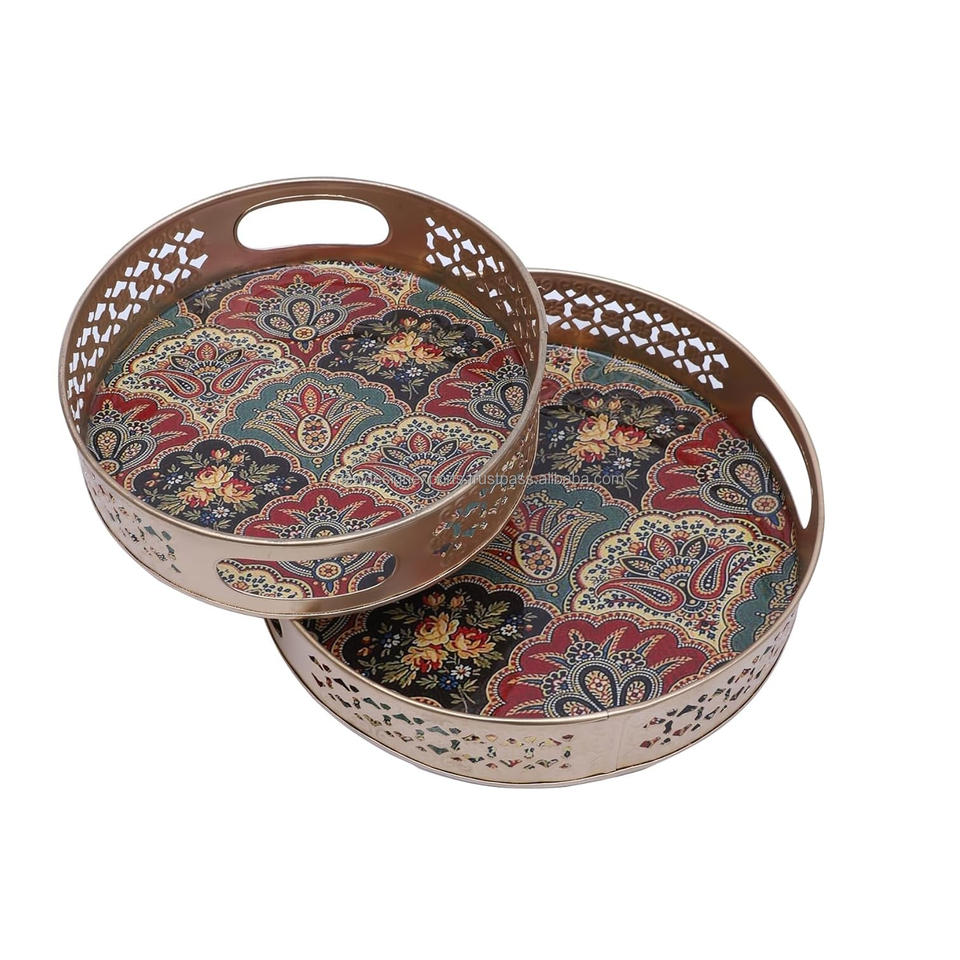 Golden Metal Round Serving Trays Set Home Decorative Pichwai Tray for Tea/Coffee/Fruits/Snacks Cover Styles Condiments Container