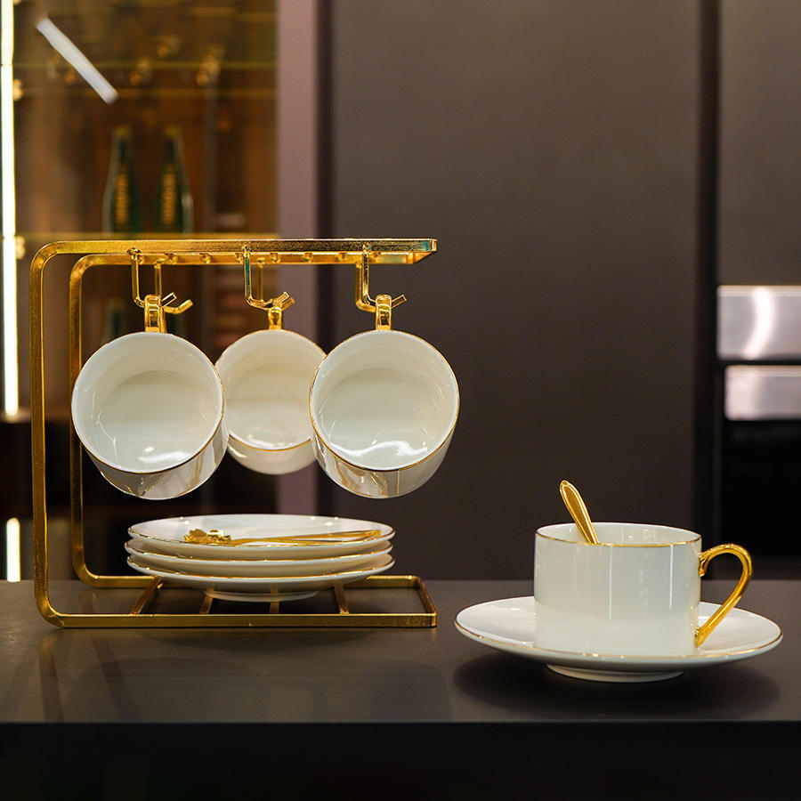 Golden Rim Ceramic Coffee Cup Set 6 Piece With Metal Rack Gold Plated Nordic Style For Party Use