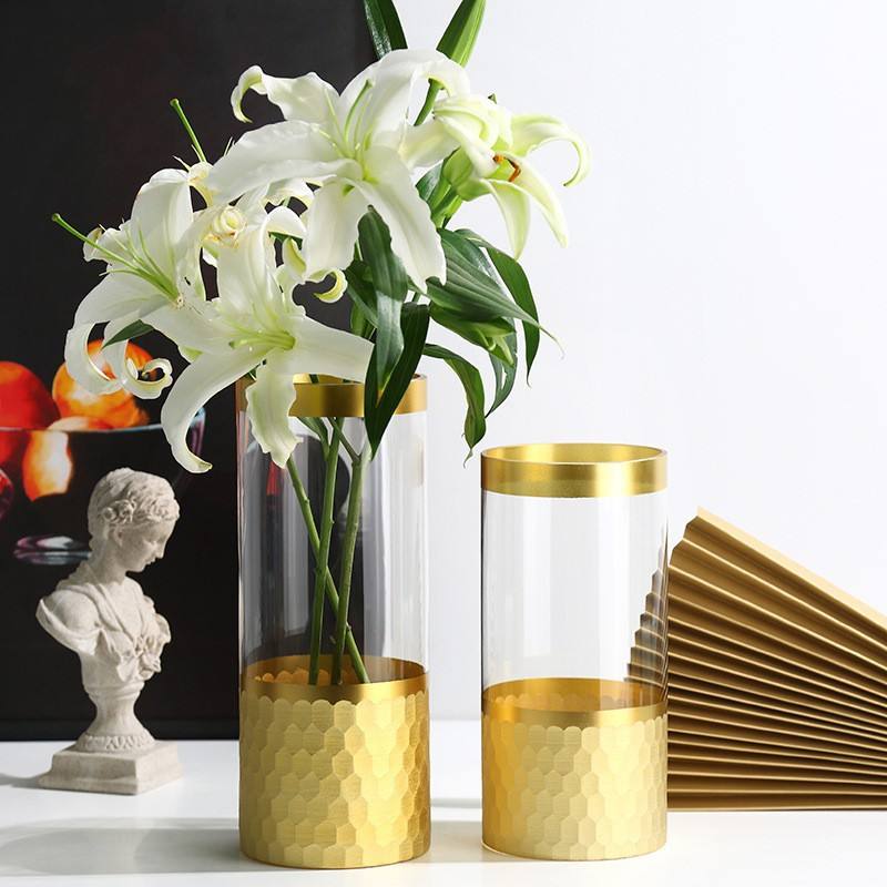 Golden Transparent Cylinder Glass Vase with Gold Border Relief for Home Decoration in Living Room Dining Table Hydroponic Vase