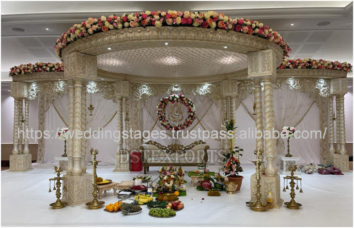 Golden Triveni Wooden Wedding Mandap UK Hot Selling Easy Installation Traditional Hindu Wedding Triple Pillar Mandap Set Export
