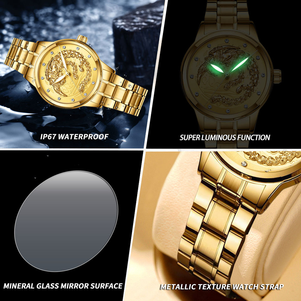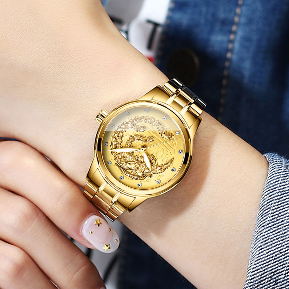 Golden Women's and Men Watch Waterproof Luminous Quartz Dragon Phoenix Couple Watch Stainless Steel & Leather Strap Watch