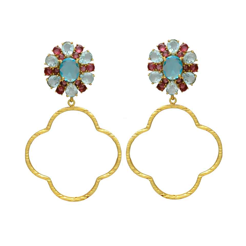 Golden Stud Flowered Earrings Set Gold Plated Brass Casual Design with Beautiful Three Unique Colours Gemstones