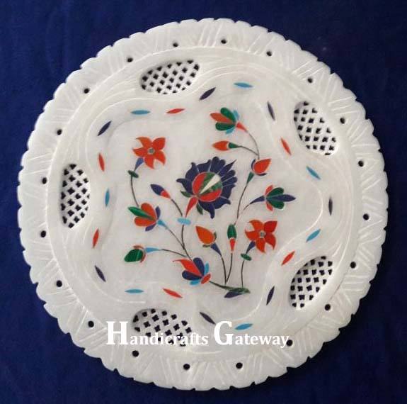 Good Looking And Beautiful Floral Inlay With Hand Carving Design Pure White Marble Decorative Round Plate For Kitchen Decorative