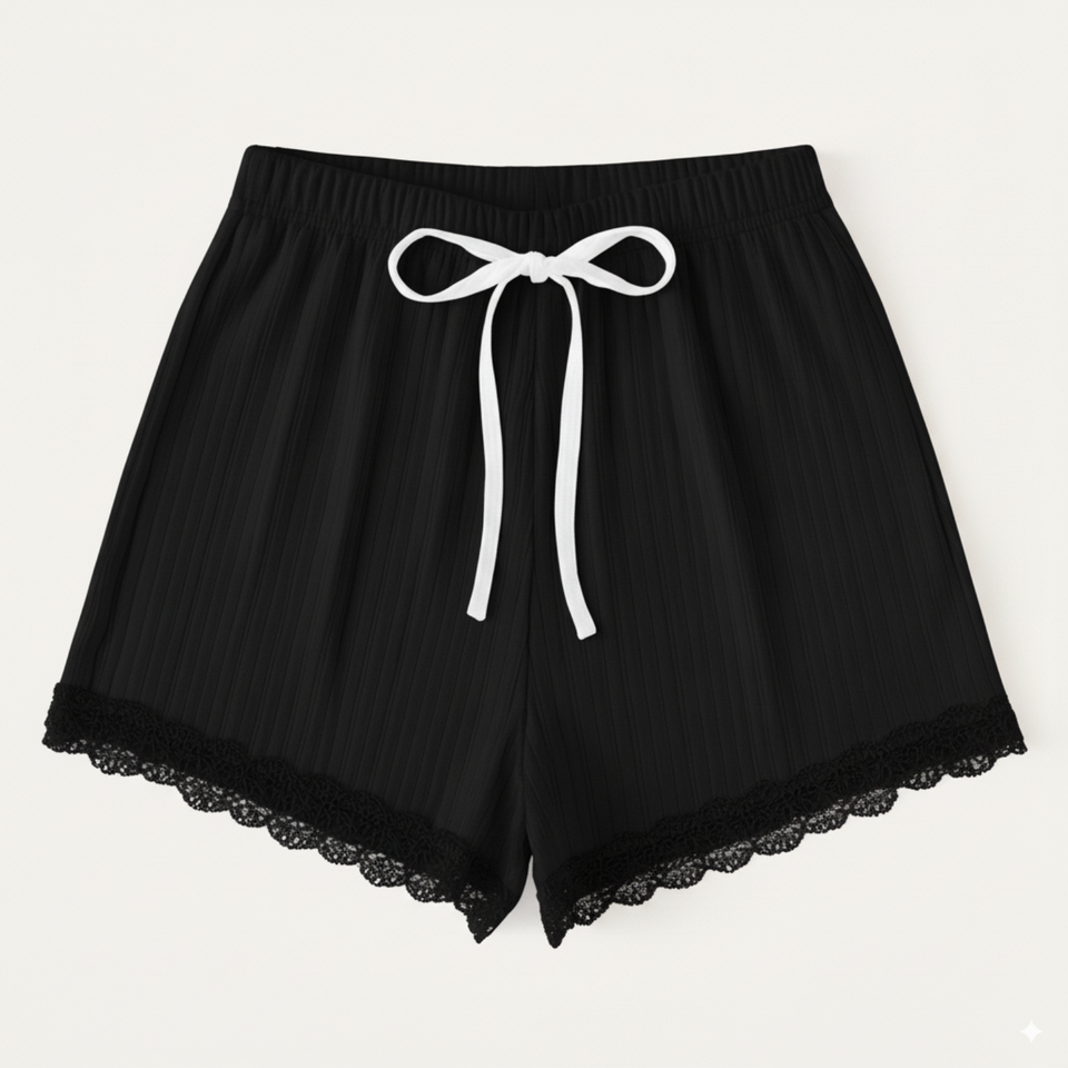 Good Price Women High Ribbed Knit Lace Trim Drawstring Breathable Quick Dry Spandex/Polyester Cozy Elastic Sleepwear Shorts