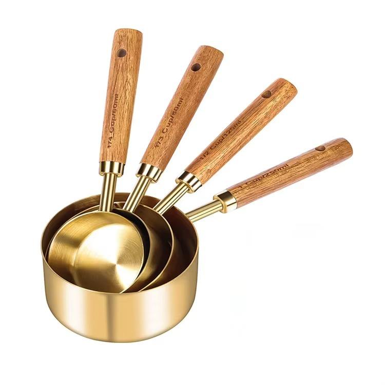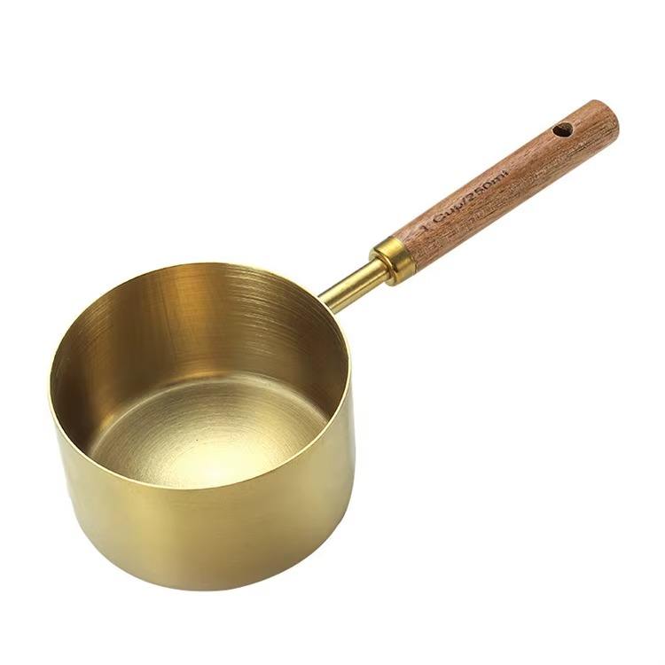 Good Selling Gold Polished Stainless Steel Measuring Cup With Wooden Handle Metal Measuring Equipment Kitchenware Tool