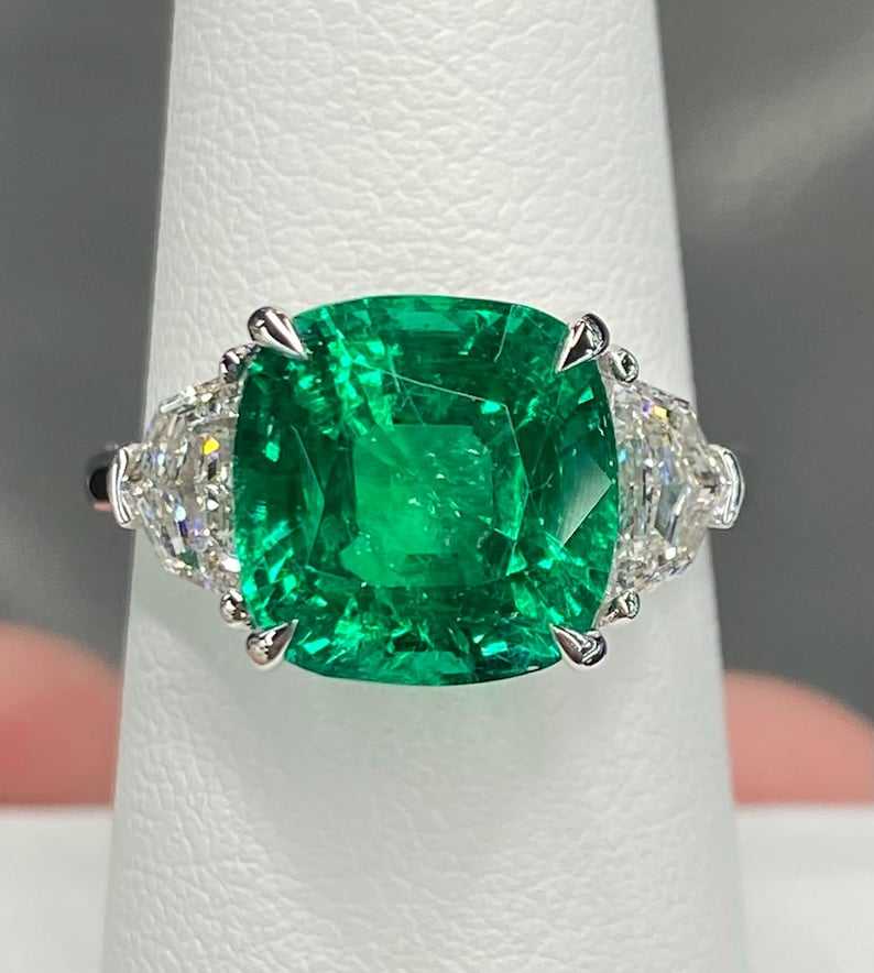 Gorgeous Gia Vivid Green Zambian Emerald Ring Silver Large Natural Cushion Three Stone Statement