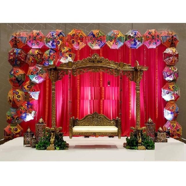 Gorgeous Mehndi Stage Peacock Swing for Bride Indian Wedding Golden Finish Swing Set Modern Wedding Jhula for Mehndi Stage