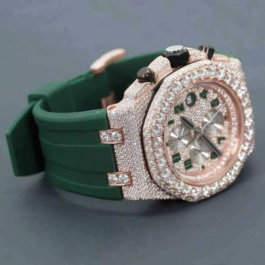 Gorgeous New Fashion Hip Hop Wrist Moissanite Watch for Men Made With Round Brilliant Cut Diamonds and Green Rubber Band