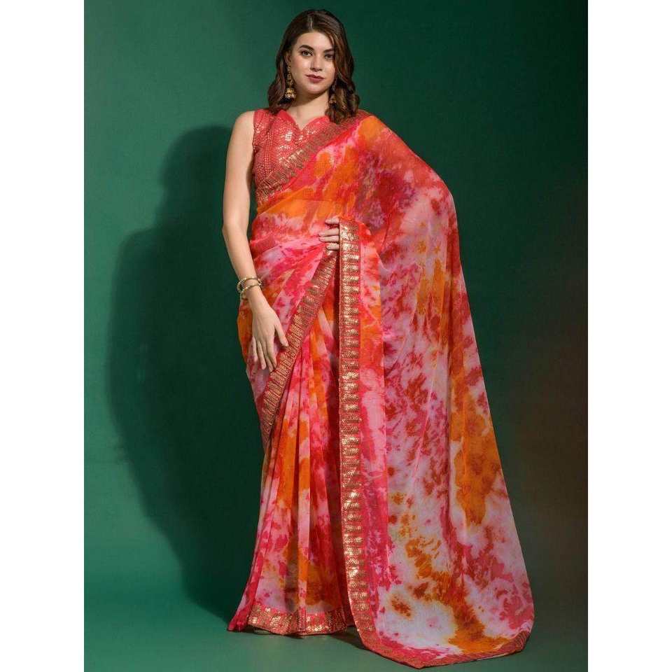 Gorgeous Pink Digital Printed Chiffon Saree with Blouse for Festive & Wedding Wear