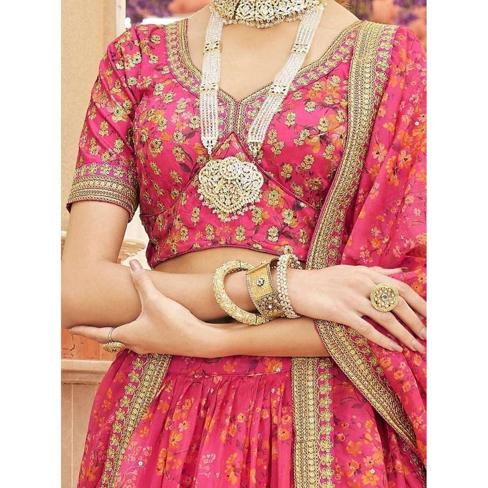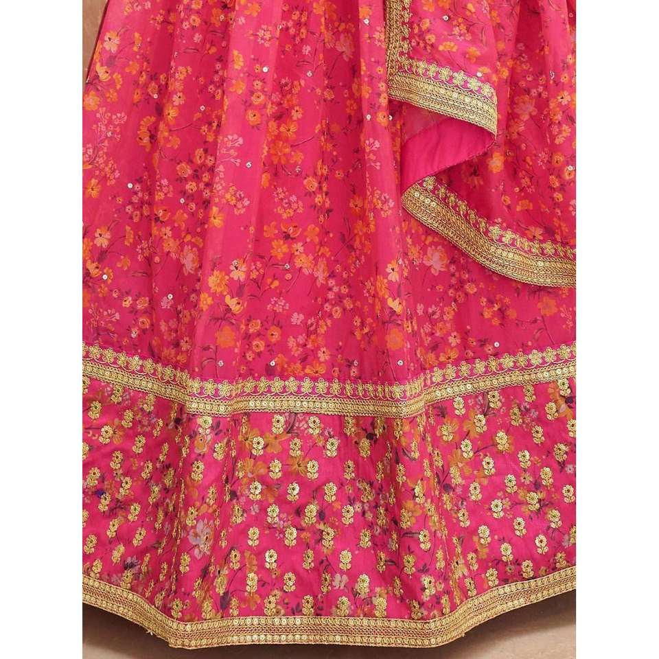 Gorgeous Pink Floral Printed Organza Traditional Lehenga Choli for Bridal Headwear