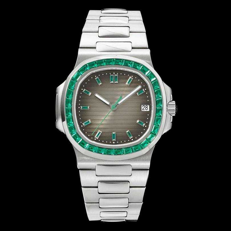 Gorgeous Square Case Green Baguette Cz Diamond Stainless Steel Unique Design Black Dial Custom Trendy Collection Watch