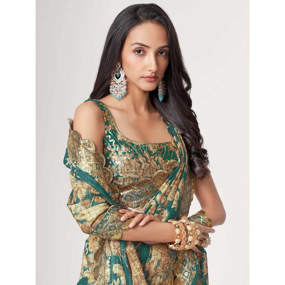 Gorgeous Teal Blue Floral Print Classic Saree with Blouse Organza Wedding Dress