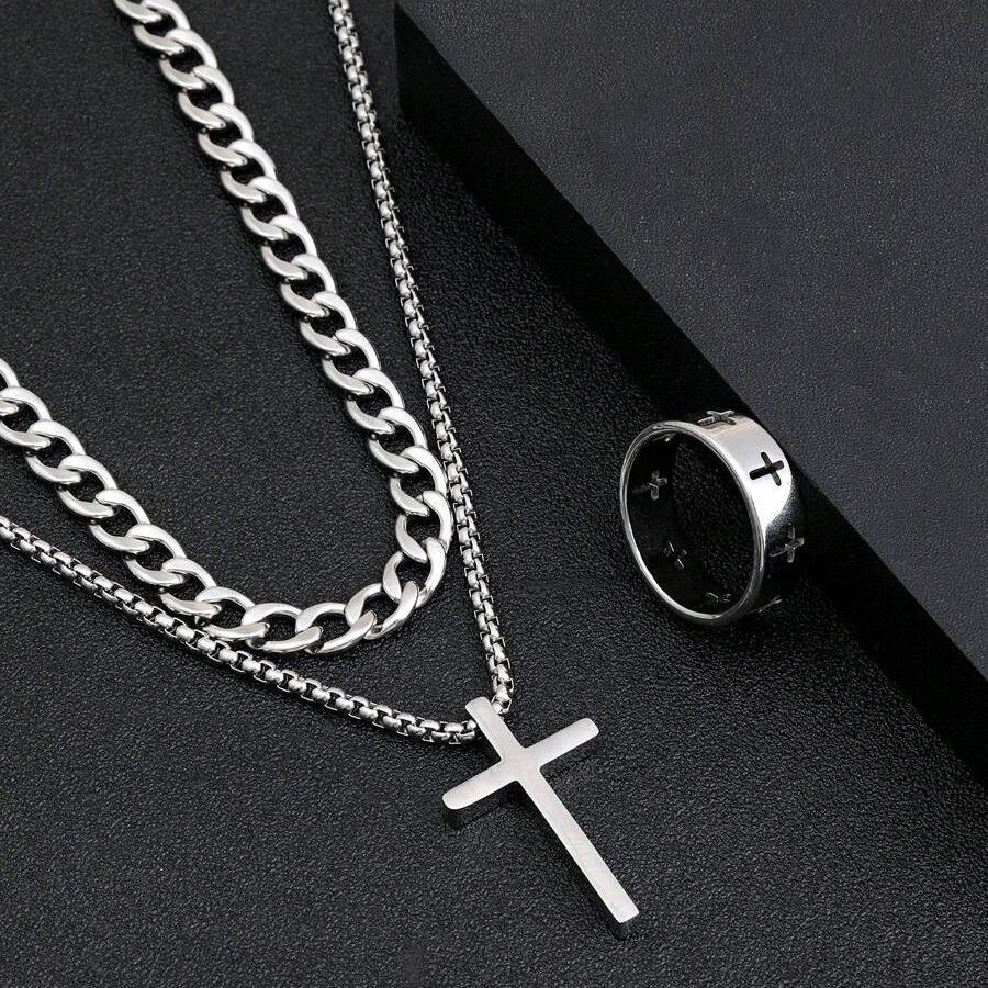 Gorgeous Vintage Stainless Steel Dark Cross Ring Necklace Bracelet Jewelry Set Ring Necklace Bracelet
