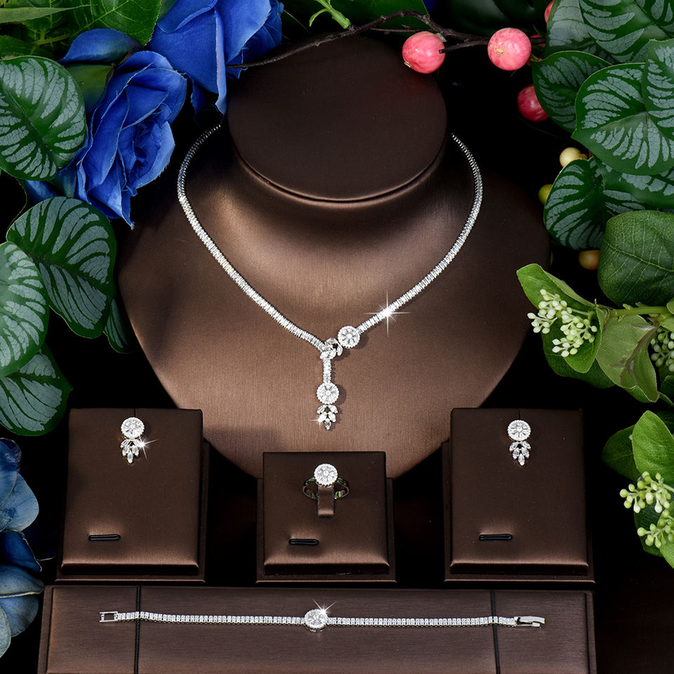 Gorgeous White Zircon Round Pendant Necklace for Women Wedding Engagement Costume Jewelry Sets Bridal Party Gifts S-432