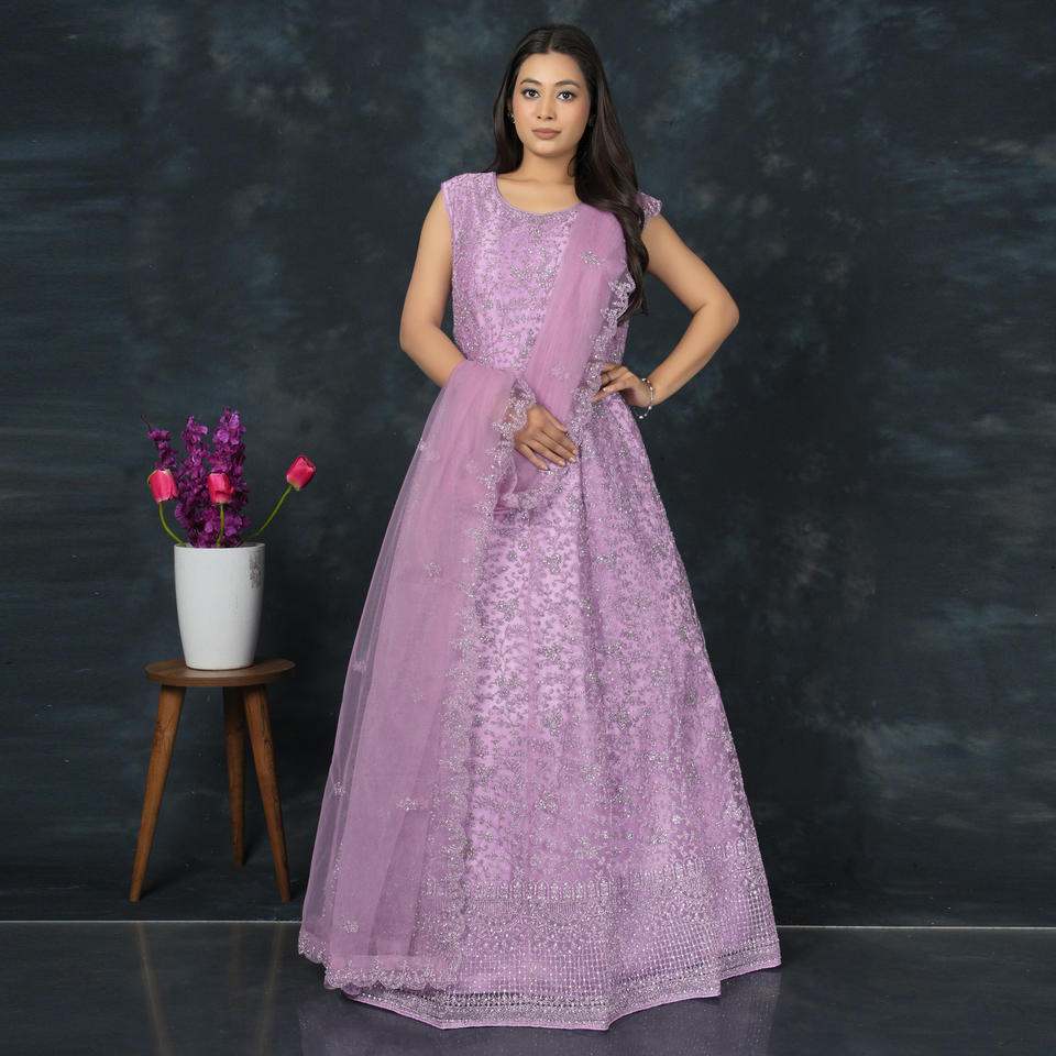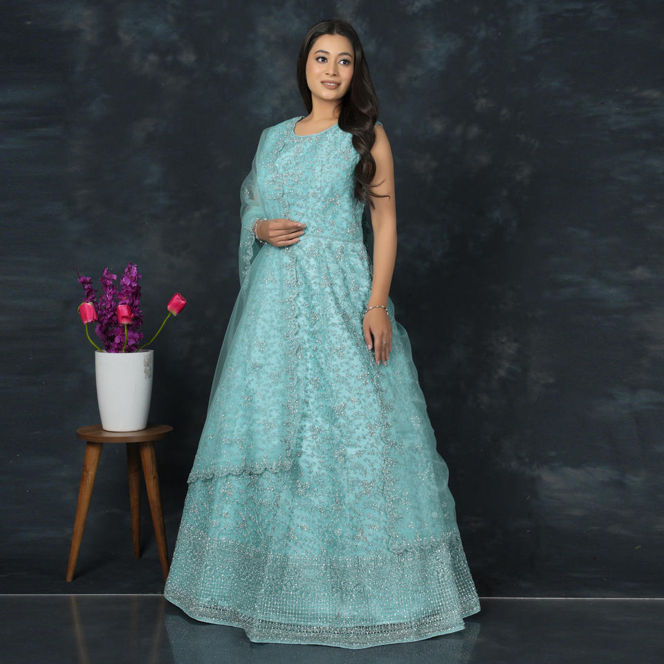 Graceful Heavy Embroidered Net Gown with Sequin Detailing and Flared Silhouette for Wedding Reception Party Wear