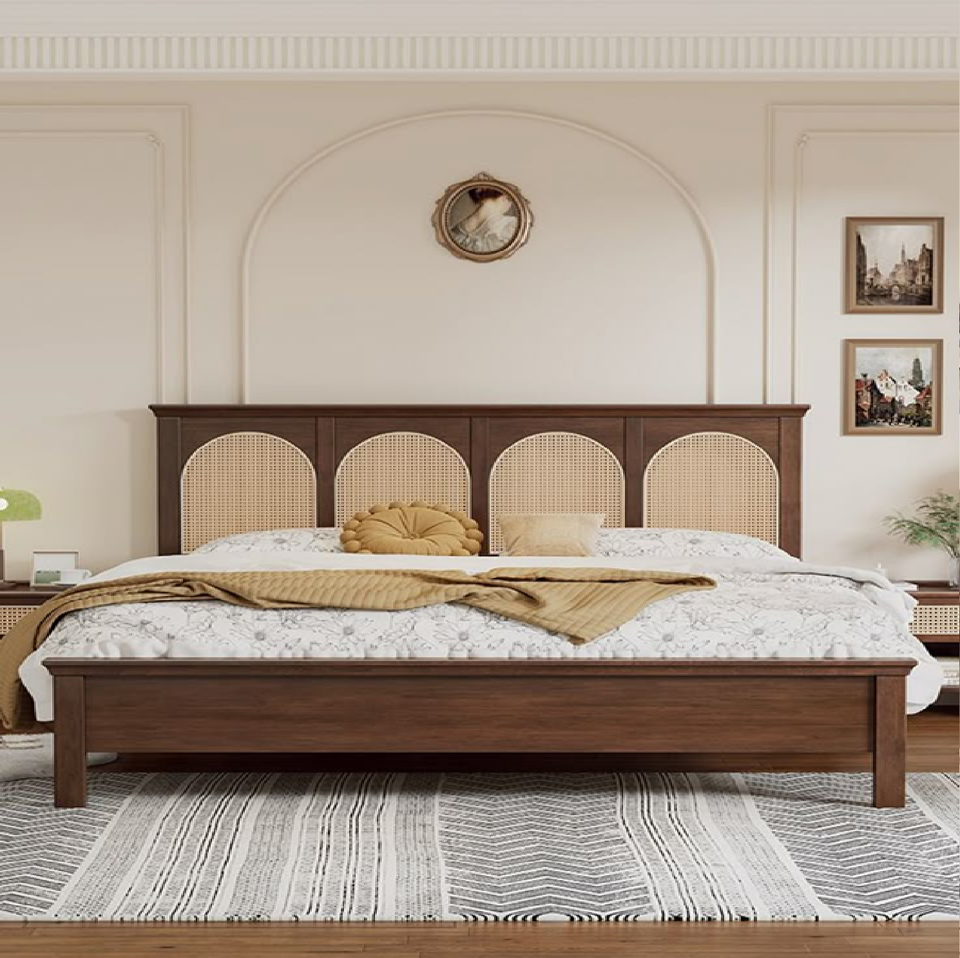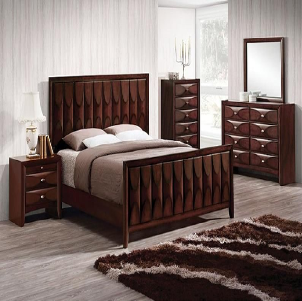 Grand ornate dark wood bedroom furniture set, luxurious carved bed, dresser, and nightstands. Available at wholesale prices.