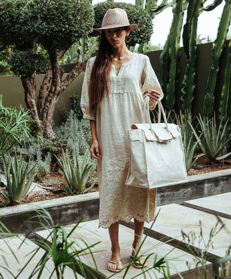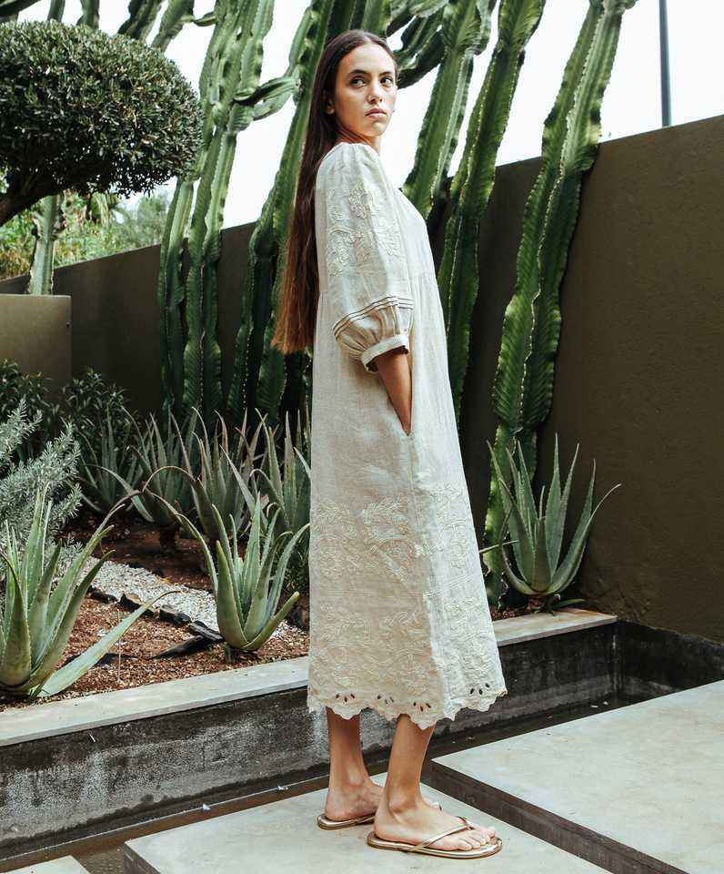 Grange Dress with Natural Linen Blend Woven Offset Contrasting Gold Lurex Daisy-Inspired Applique Perennial Bestseller Update
