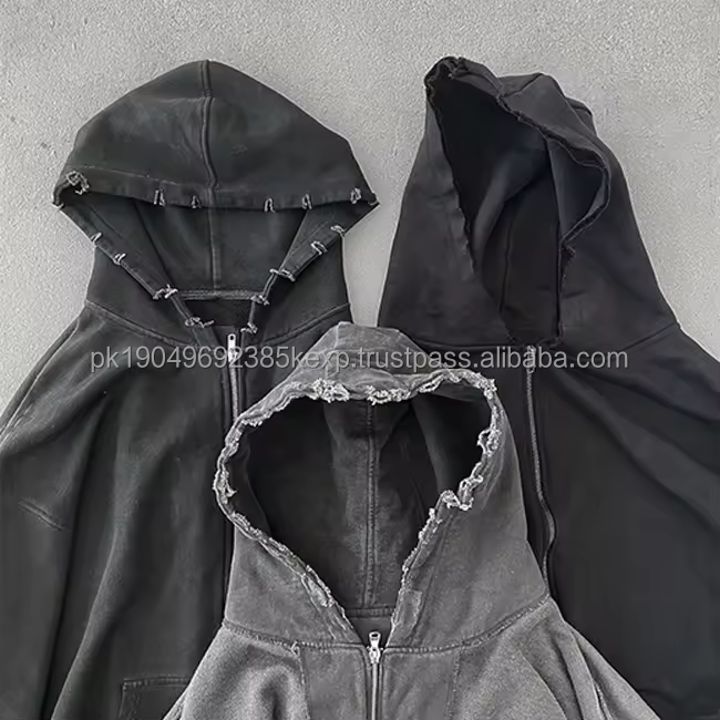 Graphic Streetwear Winter Zip-Up Ripped Men's Heavyweight 100% Cotton Hoodie 450gsm French Terry Vintage Distressed Acid Wash