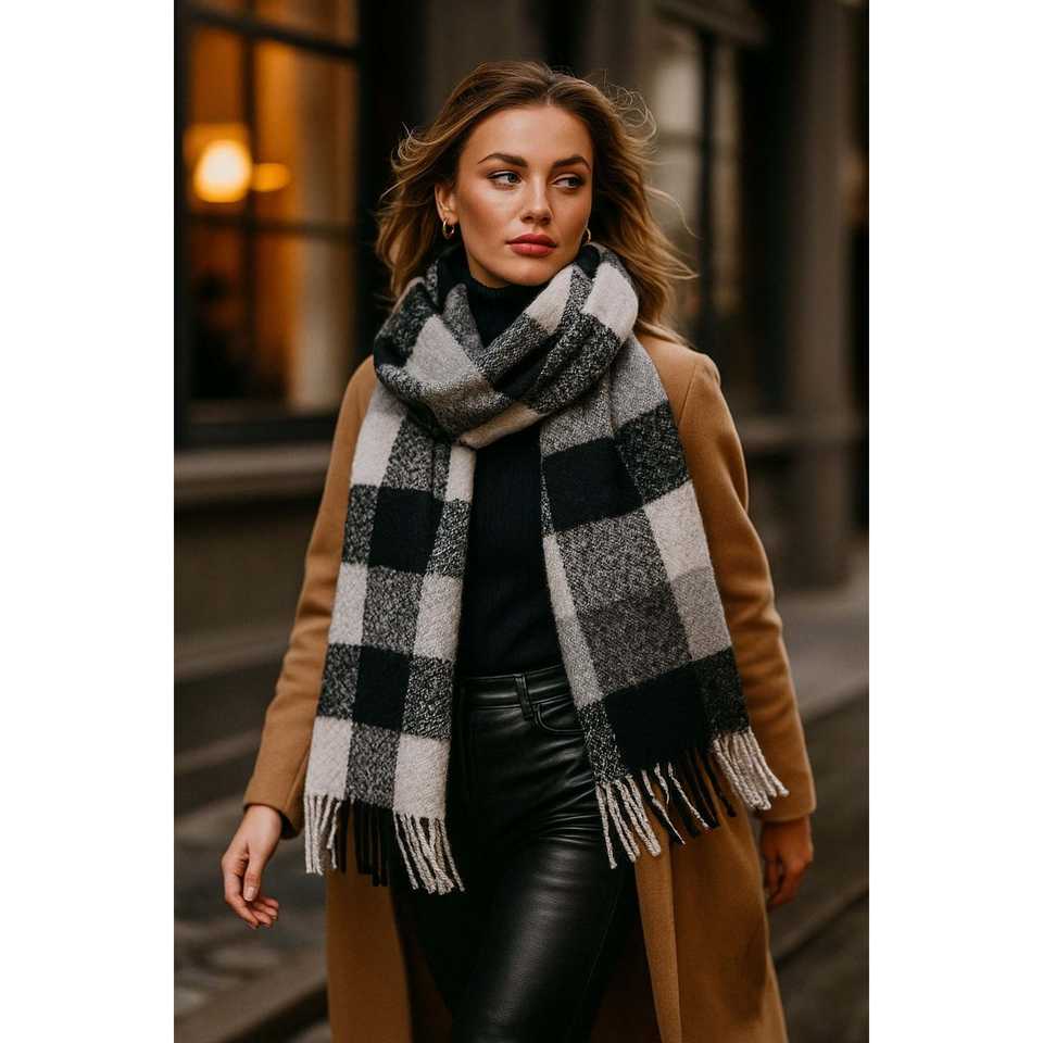 Gray Black White Tasseled Shawl/Scarf with Checked Pattern Knitted Models SAL1283