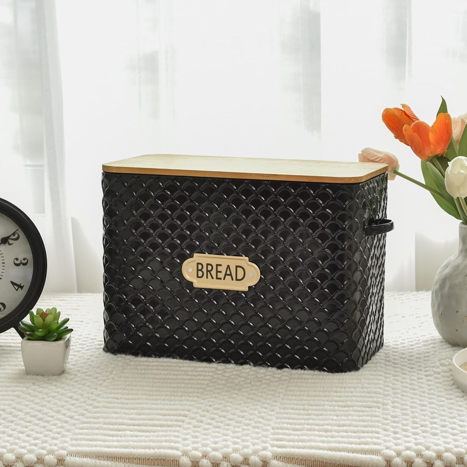 Gray bread box, chrome lid, modern kitchen, metal bread keeper, "BREAD" embossed, elegant design, wholesale.