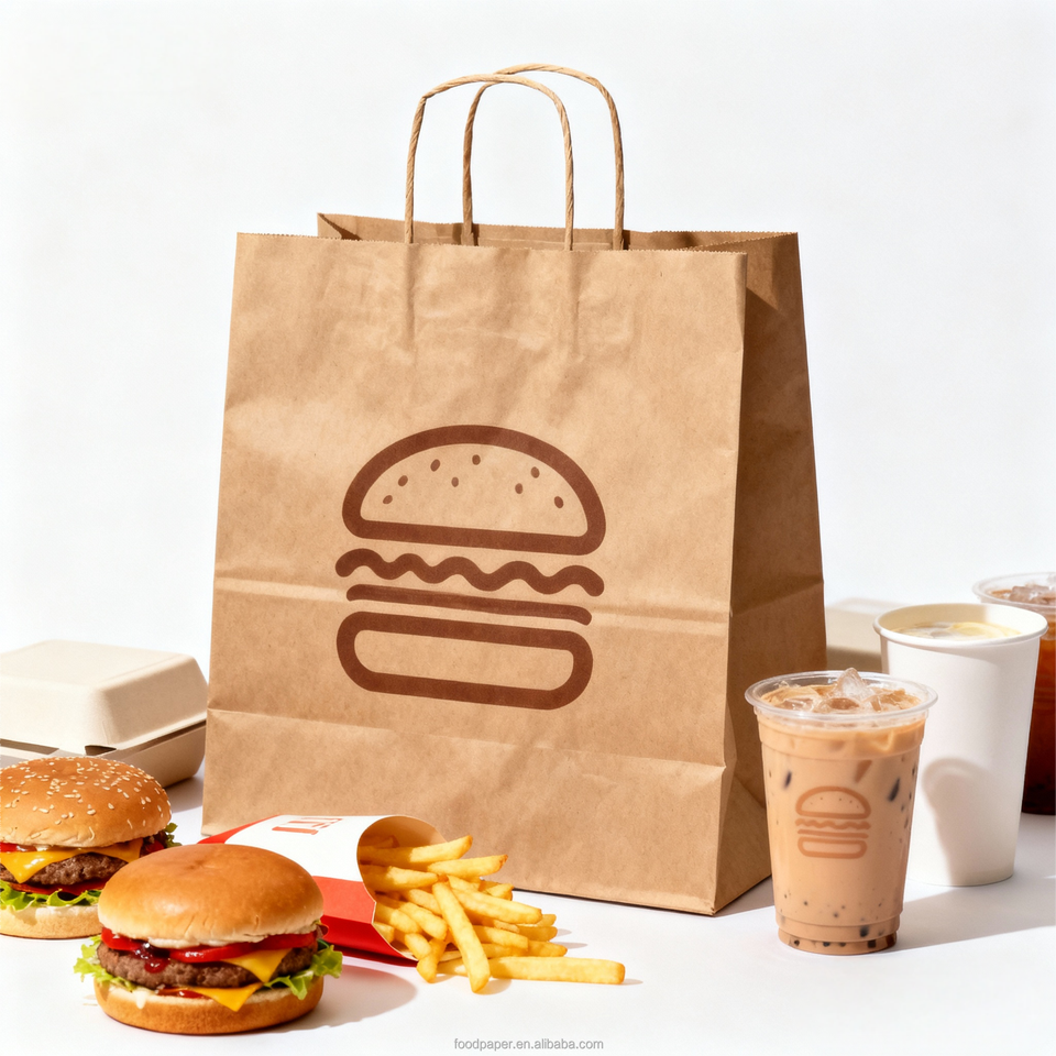 Greaseproof Kraft Paper Bag with Handles Brown for Sandwich & Panini Takeaway Cafe Delivery Custom Print