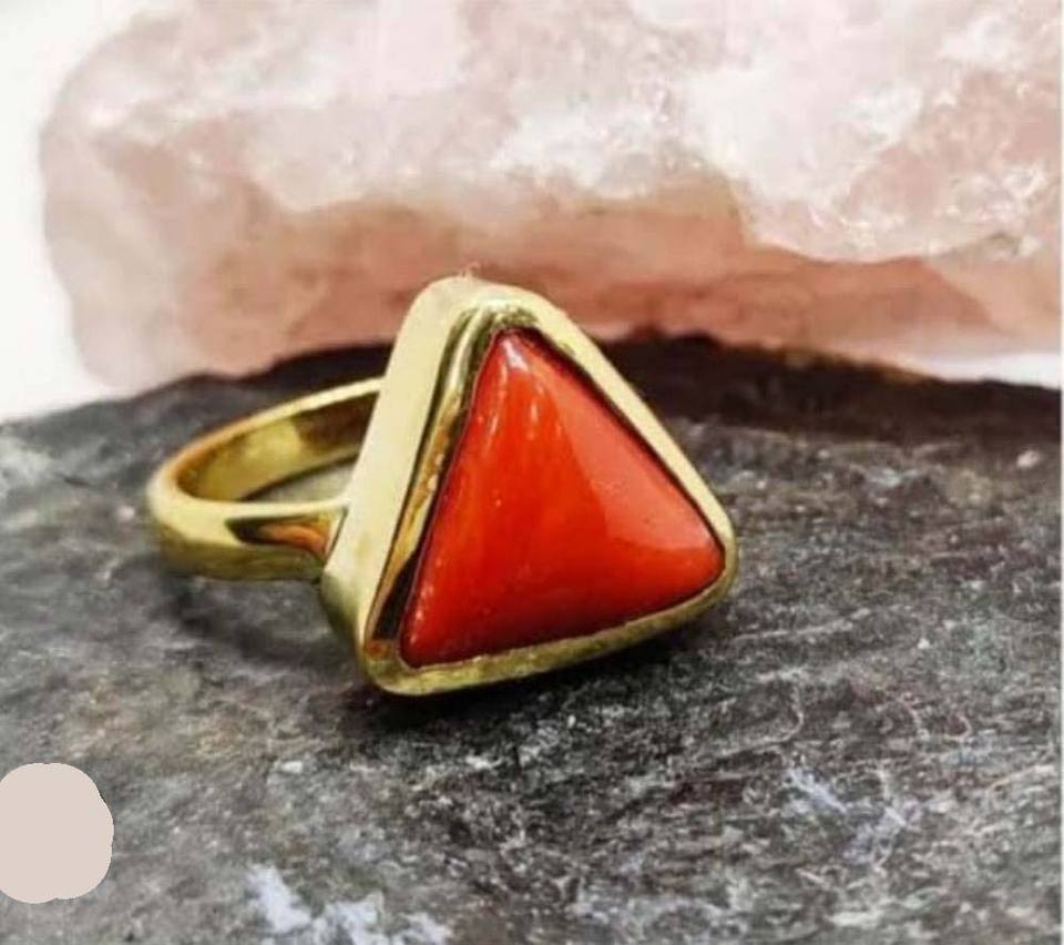Great Quality Red Coral Moonga 8mm Tringle Shape Smooth Gemstone Bezel Set 925 Sterling Silver Gold plated Ring Thin Band Ring