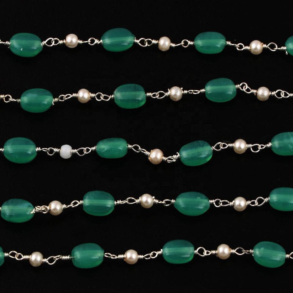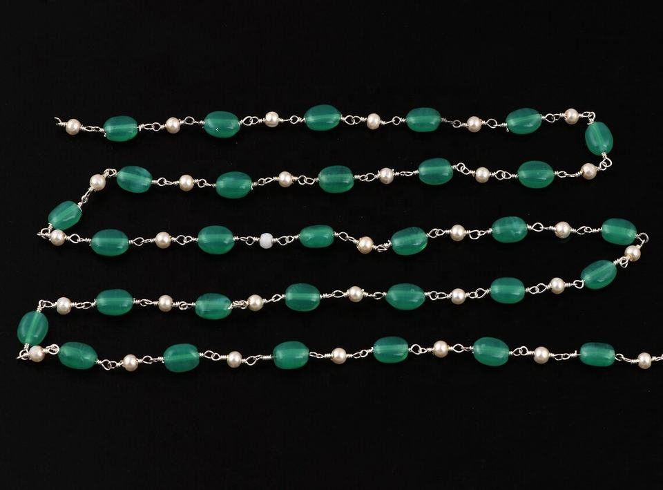 Green Aventurine Hydro & Pearl Gemstone Oval Shape Beaded Rosary Silver Plating Chain for Jewelry Making Wholesale Price Bulk