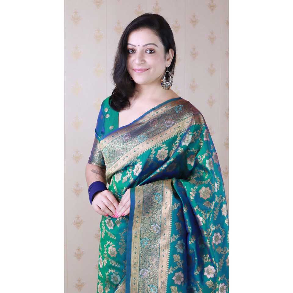 Elite Weaves Green Banarasi Jaal Woven Saree Soft Silk with Gold Zari Meenakari Luxury Handcrafted Indian Shawl 650g