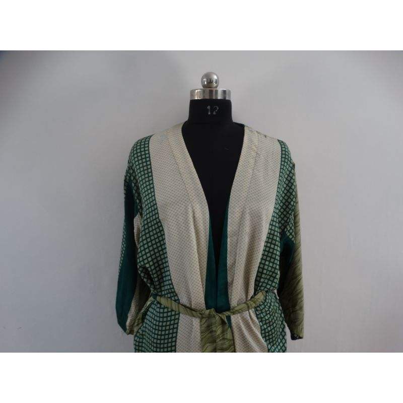 Green Colour Vintage Sleepwear Floral Kimono Indian Handmade Up-cycled Maxi Gown Silk Saree Dress Style Knee Length Bathrobe