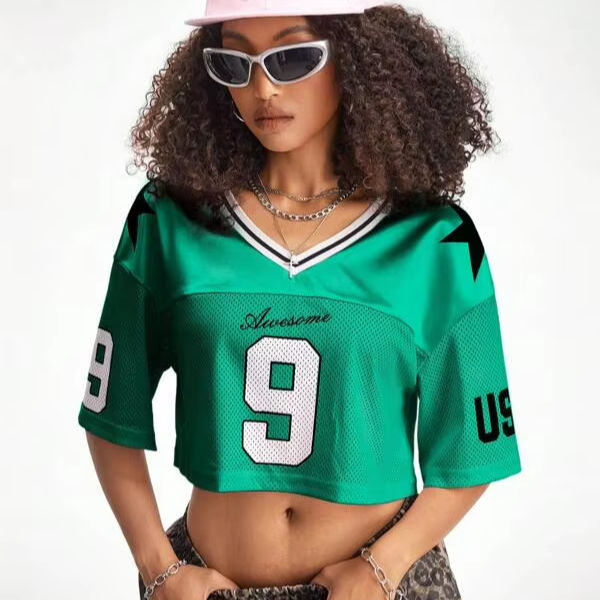 Green Cropped Mesh American Football Jersey for Women V-Neck Star Sleeve Number Custom Printed Summer Hip Hop Streetwear Top Tee