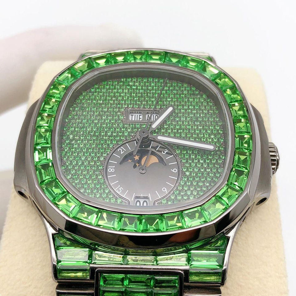 Green Diamond Full Iced Out Full Baguette Cut Diamond Wrist Watch, Hiphop Jewelry Premium Branded Luxury Watch