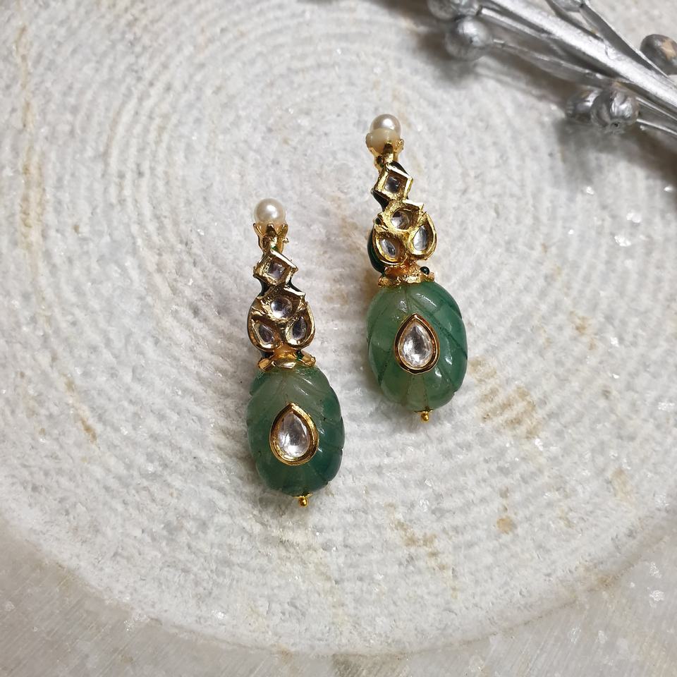 Kundan Polki Studded Gold Plated Emerald Green Carved Drop Pearl Top Earrings Traditional Indian Bridal Wedding Jewelry Set